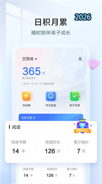 1、绑完学生账号就能远程看见语文本屏幕,每晚自动推送孩子读了几页书、写了多少字,30个汉字以上详情一页不落;
