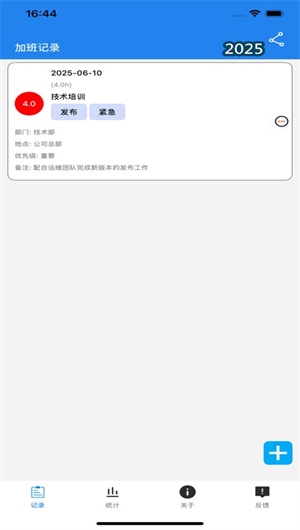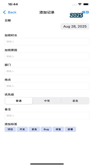 1. 精细化加班记录创建与管理:用户可通过高度自定义的加班事件创建表单,快速录入每次加班的详细信息。表单核心字段包括精确到分钟的工时起止时间戳、详尽的加班事由备注(如项目名称、紧急任务等)、以及加班发生地点记录。提交后,系统会调用实时工时计算器自动核算本次的有效加班时长,并生成一条条清晰的历史工时明细清单,所有记录均采用云端同步加密存储,确保数据永不丢失且可在多设备间无缝切换。