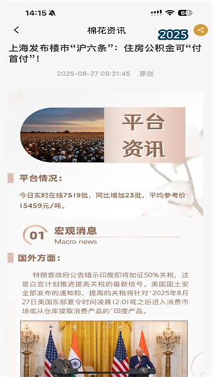 2. 全方位行业资讯与数据洞察服务:平台设有专业的全球棉花行情资讯中心,汇聚全球主要产区和交易所的实时价格、供需数据及政策动向。通过AI智能资讯聚合引擎,对海量信息进行清洗、分类和标签化,为用户精准推送深度市场分析报告和产业政策解读快报。用户可根据个性化行情预警设置,在价格达到预设阈值时第一时间接收推送,牢牢把握市场脉搏,做出先人一步的商业决策。