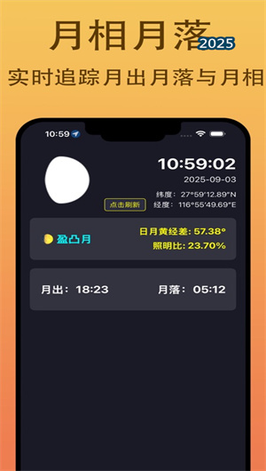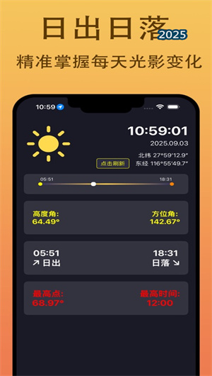 1. 精准定位与多维天文数据查询:App启动后即调用自动定位权限获取功能,通过GPS/北斗双模定位校准,精准确定用户所在经纬度,并据此生成专属的本地化天文信息报告。报告核心内容包括当日精确到秒的日出时间节点与日落时间节点、民用晨昏蒙眬时段(黎明与黄昏)、以及当天的日照时长统计。用户亦可手动输入或选择全球任何城市,查询其历史与未来天象数据,满足跨地区出行规划需求。