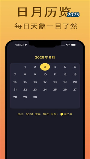 2. 可视化月相与星历信息服务:除了太阳活动,App还提供了详尽的月球信息。其月相周期模拟器以精美的图形动画展示当前的月相状态(如朔月、上弦月、望月、下弦月),并标注准确的月出月落时间戳。同时,功能强大的天体日历浏览器允许用户以日历形式纵览整个月的天文事件,如超级月亮、新月日期、行星合月等,并支持设置月相变化推送提醒,让您绝不错过任何重要天象。
