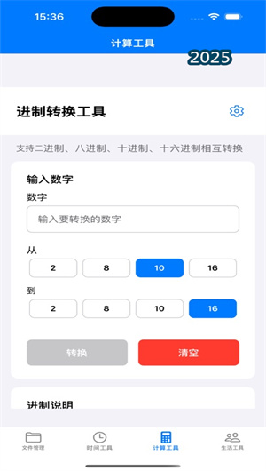 面向开发者和学生群体,计算工具模块内置了专业的多进制转换器。它支持在二进制、八进制、十进制、十六进制之间进行快速、准确的相互转换。用户在任何进制下输入数值,其他进制的转换结果会实时显示在对应的结果输出框内,实现了动态实时计算。该工具还集成了基本的位运算功能,如与、或、非、异或等,并同样配有错误校验机制,对非法字符输入进行即时提示,使其成为一个轻量级但功能完备的编程辅助计算器。