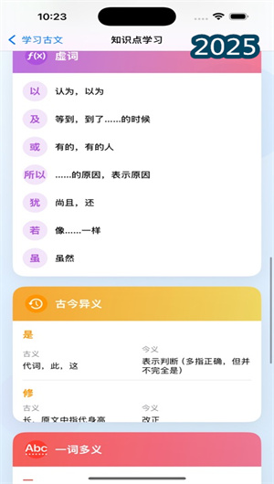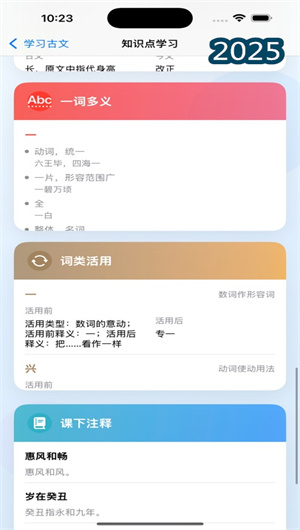 1. 词类活用详解:专门针对文言文学习难点开发的词类活用分析模块,系统归纳名词活用为动词、使动用法、意动用法等常见活用类型。每个类型配备典型例句与语义变化分析,通过对比现代汉语用法突出文言文特色,使这一难点内容的掌握程度提升约50%。