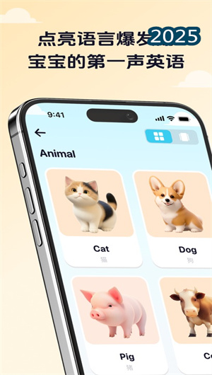 平台构建科学单词卡片库,每张卡片采用真实认知插画与可爱形象设计相结合的方式,通过视觉记忆强化帮助幼儿建立单词形象关联。系统基于认知发展阶段智能推送适龄内容,支持全屏沉浸学习与快速列表复习两种模式自由切换。配合自然发音示范和重复记忆机制,确保幼儿在愉悦学习体验中掌握核心词汇,目前词汇库已涵盖1000+必备单词。