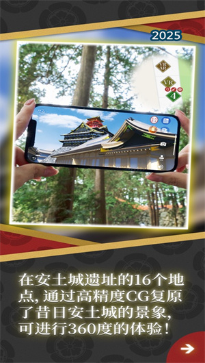 1. 全方位遗址定位与360度CG沉浸游览:安土城App的核心功能在于其精准的遗址定位与高精度CG复原能力。应用在安土城遗址的16个关键地点设置了虚拟导览点,当用户抵达实地或于线上选择相应点位后,即可启动360度全景体验功能。该功能基于严谨考据,通过三维点云数据重建了昔日安土城的宏伟景象,用户可通过手势操作自由旋转、缩放视角,从不同角度审视天主台、本丸等结构的细节,实现从现实废墟到虚拟盛景的无缝切换,获得身临其境的现场体验。