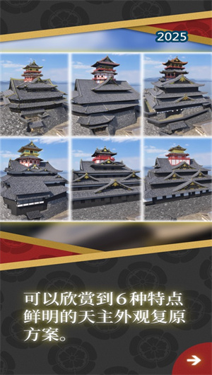 2. 多元天主外观与内部结构深度探析:为展现学术界的多元观点,本App独具匠心地集成了6种天主外观复原方案。用户可以在App内一键切换不同学者基于《信长公记》及考古发现所提出的复原假说,从传统的层塔式到更具革新性的设计,进行直观的对比与研究。不仅如此,App还开放了天主内部体验功能,用户可以“进入”这座日本战国最高建筑的内部分,观摩其障壁画、室内空间布局以及信长可能处理政务的场景,深度理解其作为政治中心的象征意义。