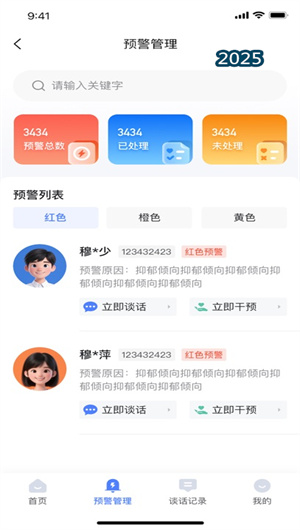 平台具备7x24小时实时监测能力,构建了一道不间断的心理安全防线。一旦系统通过预警模型识别到学生的心理指标出现异常波动,会立刻触发三级预警机制(如红、黄、蓝三色预警)。系统会生成预警信号并通过消息推送功能,实时将警报及简要情况发送至相关心理老师的移动端。这种高效的信息流转确保了从发现问题到启动干预的干预时效性大大提升,为解决传统方式信息滞后的痛点提供了关键技术保障。