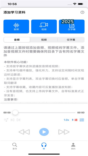 小幕狂听APP是一款专注于语言听力训练的智能化学习工具,基于精准字幕同步技术与智能循环算法构建沉浸式听力提升系统。该平台通过多格式文件支持架构与本地化处理引擎,为用户提供无广告、无版权风险的纯净学习环境。系统集成了字幕快进快退控制、多模式循环训练、间隔跟读调节等核心功能,实现从听力输入到口语输出的完整学习闭环。采用美式正宗发音模型与本地翻译引擎,新用户注册即可获得基础训练包与发音指导特权,使听力训练效率提升约40%,重新定义智能化语言学习新标准。