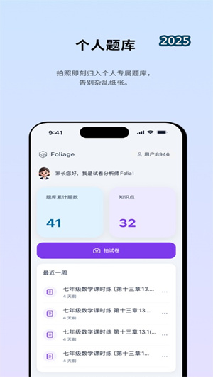 树叶不卷App(Foliage)是一款专为教育领域设计的智能个人题库管理平台,以"精准复习"为核心理念,致力于帮助学生告别盲目刷题的困境。该应用通过先进的智能识别技术和深度学习算法,构建了个性化的错题管理系统,有效缓解学生的试卷焦虑情绪。作为专业的个人题库助手,树叶不卷实现了从试卷数字化到知识点分析的完整闭环,其独特的错题溯源机制能够精准识别重复错误模式,帮助学生彻底消化做过的题目。平台集智能试卷归档、考点定位分析、定制复习卷生成等核心功能于一体,通过科学的辅导优先级建议,引导学生将有限的学习时间投入到最需要的知识环节,真正实现从"题海战术"到"精准复习"的转变。