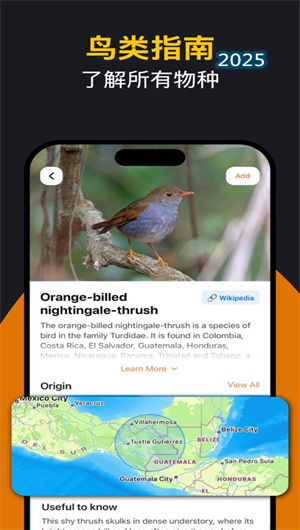 2. 鸟类图鉴数据库系统整合全球权威鸟类学资料,通过物种信息结构化存储和智能检索技术,提供全面的鸟类知识服务。物种详情页面包含形态特征描述、行为习性分析和鸣声频谱图等专业内容,分布范围地图展示物种全球分布状况,栖息地偏好说明介绍生态环境需求。季节性变化记录迁徙规律,亚种分化信息展示种群差异,保护等级标注提示物种濒危程度。这一功能使鸟类知识获取效率提高75%,成为移动的鸟类百科全书。