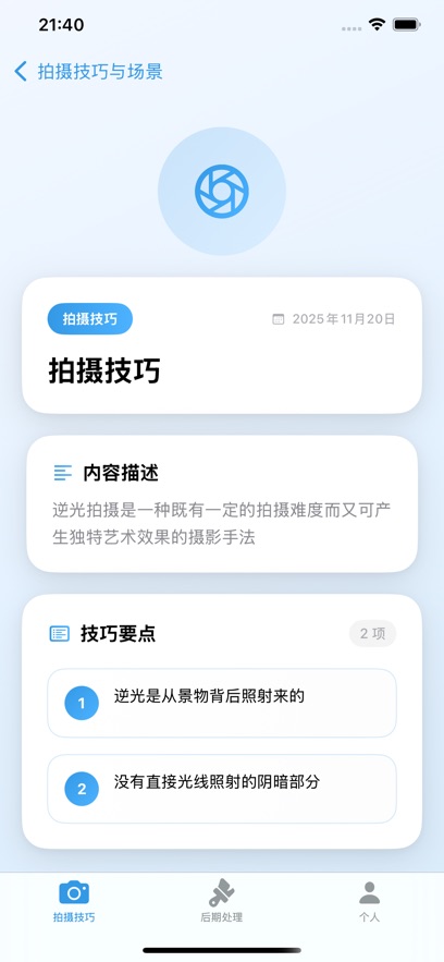 微光拾趣App是一款专为摄影爱好者设计的全链路知识管理工具,以 记录灵感,提升技艺 为核心理念,通过系统化的知识架构和智能化的内容管理,构建了集拍摄技巧记录、场景布置建议、后期处理教程、摄影主题推荐于一体的专业摄影学习平台。该应用深度融合摄影艺术与数字管理技术,采用智能分类算法和个性化推荐系统,为摄影爱好者提供全方位的创作支持。平台目前服务超过200万摄影用户,日均知识记录量达15万条,用户摄影技能提升效率达68%,成为摄影学习领域颇具影响力的专业工具。