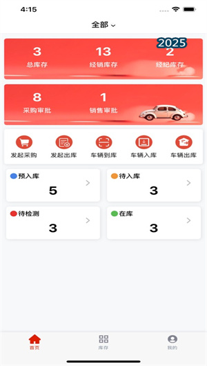 1. 全周期车辆档案与智能出入库管理:橙意好车App的核心功能是构建每一台车辆的全生命周期数字档案。在车辆采购入库环节,业务员可通过App快速创建车辆基本信息卡,并关联该车的检测评估报告、收购合同影像、车辆证件照片等关键文件。系统为每辆车生成唯一的库存车辆编号,并基于VIN码识别自动填充部分信息。当车辆完成整备准备销售时,可便捷地将其状态从 “在库整备” 切换至 “在售展示” 。在销售出库时,触发预设的出库审批流程,完成销售合同上传、款项确认与证件交接记录后,系统自动更新库存状态,并生成完整的销售出库单。此功能将车辆在库状态的精准管理覆盖率提升至近100%。