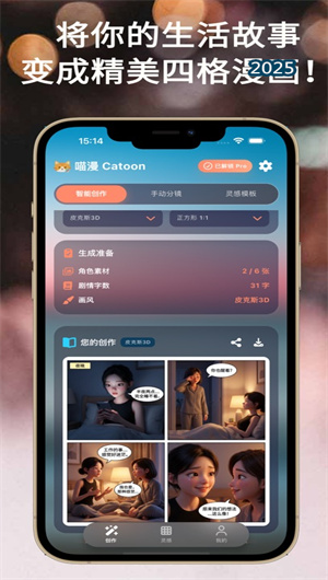 3. 智能与手动协同的分镜编辑工作台:喵漫App提供了灵活的分镜创作模式以满足不同需求。在 “智能全自动模式” 下,AI将依据故事内容或照片主题,自动完成分格布局、镜头景别分配(如特写、中景、全景)及基础构图。在 “专业手动模式” 下,用户则进入功能完整的分镜编辑工作台,可以自由拖拽调整每个画格的尺寸与位置,使用丰富的素材库(如预设的对话框气泡、拟声词字效、气氛纹理)进行精细化装饰,并直接在工作台内为每个画格添加或修改角色台词与旁白文字,实现从AI辅助到完全自主掌控的创作体验。