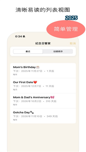3. 多视图展示与智能排序管理:应用提供了 “日历视图” 与 “列表视图” 两种核心浏览方式。日历视图直观展示月度分布,方便进行长期规划;而 “即将到来”列表视图则具备智能自动排序功能,它会根据当前日期,将所有未到来的纪念日按照时间远近进行动态排序,让 “下一个重要日子” 始终位于列表顶端,一目了然。用户还可以根据关系标签(如“家人”、“朋友”)或纪念日类型进行筛选查看,实现了对复杂纪念日集合的高效、清晰管理,尤其适合需要同时管理情侣、家人、宠物等多维度纪念日的用户。
