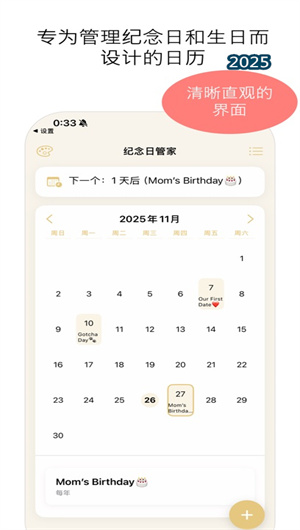 3. 轻社交分享与纪念日祝福助手:在保护隐私的前提下,应用提供了便捷的纪念日分享功能。用户可以将即将到来的某个纪念日(如家人的生日)生成一张精美的祝福提醒卡片,通过社交应用分享给其他亲友,邀请他们一同准备或送上祝福。应用还可根据不同的纪念日类型,提供一些简单的祝福语参考或礼物灵感提示,扮演一个贴心的 “纪念日策划小助手” 角色。