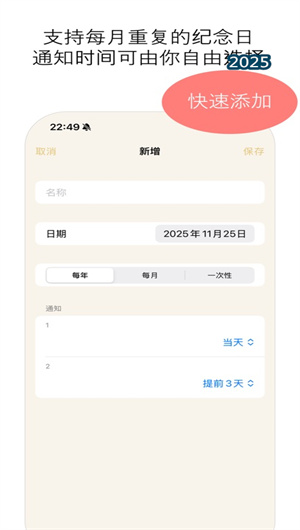 2. “重复规则高级编辑器”与复杂周期支持:除了标准的年、月重复,应用为高级用户提供了 “自定义重复规则编辑器” 。用户可以设置诸如 “每年X月的第Y个星期Z” (如母亲节)、 “每隔N年重复一次” 等复杂周期。这使其能够覆盖几乎所有可能的周期性纪念日,甚至包括一些基于农历的生日,展现了其作为专业工具的强大性与灵活性。