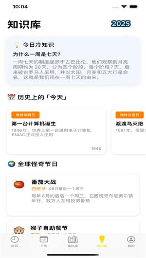奇特多元历App内嵌了一个庞大的时间知识图谱数据库。其“历史上的今天”模块,不仅涵盖重大历史事件,还包含科技发明、文艺创作等多元内容。“全球怪奇节日”板块则收录了世界各地的奇特庆典(如西班牙番茄节、泰国猴子自助节),并配有图文介绍与起源故事。此外,时间冷知识专栏会每日推送关于历法起源、时间计量演变等有趣内容,例如“为什么二月天数最少?”“干支纪年如何循环?”等,将应用的使用过程变为一场持续的时间文化探索之旅。