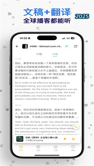 1. AI驱动的智能文稿与翻译系统:播刻岛的核心是强大的AI处理流水线,它能对任意播客音频进行实时语音转文字处理,生成高精度的逐字文稿。更重要的是,系统通过集成的神经网络翻译模型,将原文实时翻译为流畅准确的中文,并提供原文模式、译文模式及双语对照模式三种显示选择。所有文字与音频保持精准时间轴对齐,用户点击文稿中的任意句子,音频即可智能跳转至对应位置,实现了“听”与“读”的完美同步,使内容理解效率提升约60%。