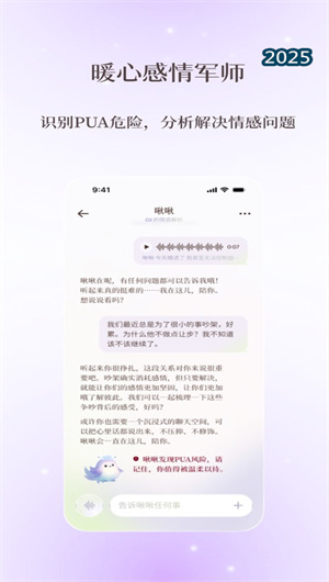 1. 对话式人工智能情感伴侶“啾啾军师”是本应用的核心亮点。不同于传统聊天机器人,“啾啾”基于情感共情计算框架与上下文深度理解模型,能够在复杂情感叙述中准确识别核心诉求与未言明的情绪。它不提供通用建议,而是通过情景化策略生成器,结合该关系特有的历史互动模式、双方性格倾向及当前情感天气,产出高度定制化的行动方案。其语言风格温控系统确保每一次交互都传递出支持性而非指导性的陪伴感。