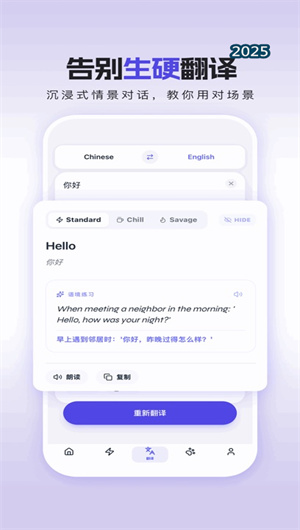 2. 语境智能翻译与个性化表达工坊:应用集成了先进的神经网络翻译模型,但其亮点远超字面转换。其智能情景翻译功能能精准理解中文习语、网络热词乃至复杂情绪(如“购物一时爽,月底泪汪汪”)背后的语境与含义,并提供多种风格的英文表述选项,如标准书面语、随性口语体或犀利评论风。这实质上是一个动态表达库,用户不仅获得翻译,更学习到同一含义在不同社交场景下的地道英语表达,从而告别生硬直译,逐步构建起自己生动传神的个性化表达体系。
