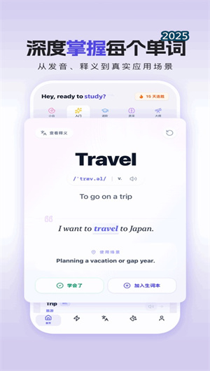 1. 可组合式“语言积木”与创造性输出引导:本应用的深层教学理念亮点在于其“积木式语法”与“词汇搭配库”。系统不仅教单个单词,更重点展示其作为“积木”如何与其他词汇(如介词、搭配动词)组合成有意义的“结构块”(如“take up a hobby”)。在造句或翻译练习中,鼓励用户像玩乐高一样,调用已学“积木”进行创造性句子搭建,并提供多种可选方案。这种从“模块”到“架构”的学习方式,直指语言运用的本质,有效培养了用户的语感和生成性语言能力。