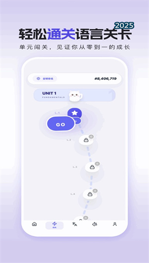 1. 结构化知识图谱与分级闯关系统:本功能构建了应用的学习骨架,即一套从“入门积木”到“高级架构”的科学分级学习体系。所有知识点,包括核心词汇、实用短语及语法要点,都被拆解为可被逐个掌握的“知识积木”,并有序分布在数百个渐进式学习关卡中。每个关卡都是一个精心设计的语言搭建任务,用户需通过学习单词的生动例句、完成交互练习来解锁进度。闯关模式不仅使学习进阶之旅清晰可见,更通过即时的正向反馈(如关卡星星、解锁勋章)将漫长的学习计划,转化为有明确里程碑的游戏化进阶之旅,有效维持学习动力。