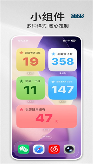 3. 个性化桌面小组件与智能提醒中心:应用深度整合系统特性,提供了多种样式与尺寸的桌面小组件。用户无需打开App,即可在主屏幕或负一屏直接查看关键倒数日信息,如剩余天数、纪念标题。小组件支持用户手动选定需要展示的特定纪念日,也提供“智能推荐”模式,由算法根据临近程度和重要性自动呈现。同时,内置的智能提醒引擎允许用户为每个纪念日或纪念集设置个性化的提醒规则,不仅支持在纪念日当天推送通知,更可预设提前30天、100天或一周年等关键节点进行温馨预告,确保用户永不错过任何重要时刻。