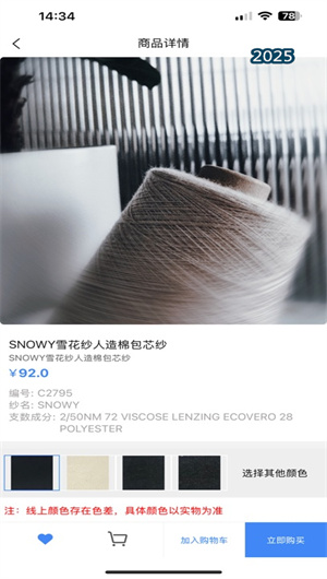 2. 沉浸式数字化选色与样品体验:平台深度开发了在线选色工具,用户可在屏幕端对同一款纱线的数十种颜色进行直观对比,并支持将选中颜色保存至个人虚拟色卡簿。针对重点新品,平台提供免费样品申请服务(限首次),用户可在线提交样品需求,经审核后即可收到实物小样,实现了“线上初选+线下确认”的混合体验,有效解决了线上采购材质与色感偏差的行业痛点。