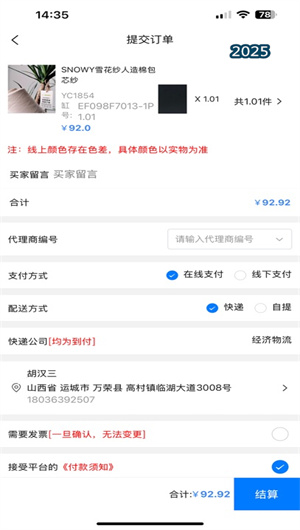 2. 动态库存可视化与全链路订单管理系统:平台接入了合作纱厂的ERP数据接口,实现真实库存数据的分钟级同步与可视化展示。用户在下单前可清晰查看各颜色、批次的现货数量,有效避免缺货纠纷。订单系统支持批量下单、多地址分拆及合并支付,并自动生成带平台水印的形式发票供企业请款流程使用。从下单到收货的全流程均可在订单追踪中心实时查看,包括仓库处理状态、物流轨迹及签收确认,构建了透明可信的数字化履约闭环。