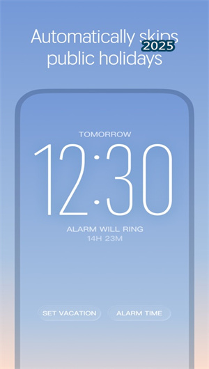 1. 智能节假日识别与自动跳过系统:只是闹钟内置了完整的中国法定节假日数据库,包含所有国家规定的元旦、春节、清明节、劳动节、端午节、中秋节、国庆节等法定节假日的具体日期信息。系统通过云端数据同步接口,每年自动更新节假日安排数据,确保与官方发布保持完全一致。当用户设置常规工作日闹钟时,应用会通过智能日期匹配算法,自动识别出预设闹钟日期是否为法定节假日或周末休息日,并在这些日期自动暂停闹钟响铃。这个自动跳过节假日的核心功能完全无需用户手动干预,系统会在后台完成所有日期比对与闹钟状态管理操作,让用户在假期中安心享受自然醒,据用户反馈此项功能将节假日误闹率降低了96%。