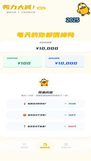 2. 情感化鸭鸭手帐本与薪酬趣味计量系统提供了情绪出口与认知重构工具。在倒计时的每一天,用户都可以打开专属的 “鸭鸭心情手帐” ,通过上传随手拍的工位照片、记录当下的离职心情语录或书写自由畅想日记,来留存这段特殊时期的心路历程。同时,应用独创 “带薪摸鱼计量仪” ,用户输入自己的税前月薪后,系统会实时计算出截至目前今日已赚取的薪资,并将其幽默地等价换算为 “脆皮鸭套餐数” 或 “续命奶茶杯数” 。这种将抽象劳动报酬具象化的方式,为枯燥的上班日注入了一丝游戏化的趣味和即时满足感,让心态从“为老板打工”悄然转变为“为自己的鸭子/奶茶而战”。