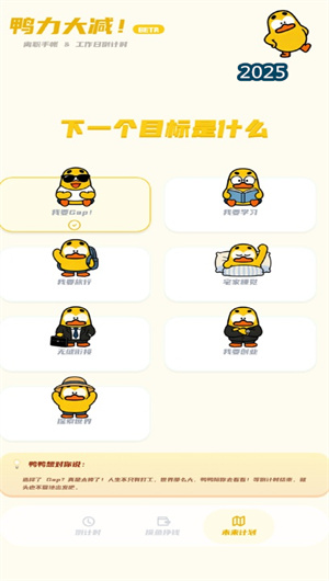 1. 将消极体验转化为积极创造与幽默解构的能力具有文化层面的创新性。鸭力大减成功地将“想离职”这一通常被视为消极、敏感甚至略带负罪感的情绪,转化为可以公开讨论、幽默对待甚至创意表达的主题。通过鸭鸭IP形象和趣味计量单位,它完成了一种温和的文化解构,让用户能以更轻松、更主动的心态面对职业转换期。这种产品理念本身,就代表着一种更健康、更积极的职场文化导向,即正视个人职业选择权,并用创意和规划来度过过渡期。