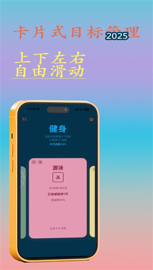 1. 循环滑动导航系统是Flow Check的标志性功能,彻底颠覆了传统列表式打卡的交互逻辑。用户通过垂直滑动手势在不同目标分类(如健身、学习、阅读)间无缝切换,通过水平滑动浏览查看同一分类下的具体目标详情。每一次滑动都伴随精心设计的流畅动画效果,如目标卡片如水波般展开,完成打卡时粒子特效绽放,这种丝滑操作反馈不仅提升了使用愉悦感,更通过降低操作阻力,帮助用户快速进入专注打卡状态,将工具本身对专注力的干扰降至最低。