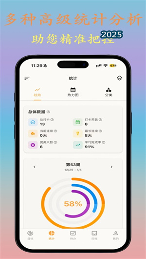 1. 多维度统计分析中心为用户提供全景式的习惯养成洞察。核心的完成率追踪面板实时显示每个目标的历史达成率与近期执行趋势。连续打卡记录器不仅显示当前连续天数,更统计最长连续记录,激励用户不断自我超越。强大的热力图日历以色彩密度直观展示一年中的打卡集中度与空白期,是审视自身行为规律与周期性波动的绝佳工具,Pro用户还可进行自定义时间段对比,分析不同生活阶段的表现差异。