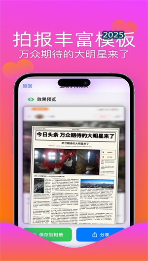 总结:拍报App以其精准的产品定位、卓越的技术实现与深刻的情感洞察,在拥挤的摄影应用市场中开辟了一条独具特色的赛道。它巧妙地将民国风报纸这一怀旧意象与现代人的社交分享、自我表达及纪念收藏需求相结合,通过极简的三步操作和强大的本地化生成引擎,为用户提供了一扇通往创意与怀旧世界的便捷之门。从SwiftUI原生开发保障的丝滑体验,到Core Graphics渲染输出的高清打印品质;从固定趣味文案带来的集体幽默,到 “手持报纸效果” 引爆的社交传播,拍报的每一个环节都围绕 “让每张照片都成为值得铭记的头条新闻” 这一核心体验精心构筑。它不仅仅是一个照片处理工具,更是一个情绪发生器、一个社交连接器、一个记忆实体化的桥梁。在追求个性表达与情感留存的时代,拍报App成功地将技术转化为温暖人心的创意,让每一位用户都能轻松地为自己生活的闪光时刻,亲手“签发”一份独一无二的头版号外。
