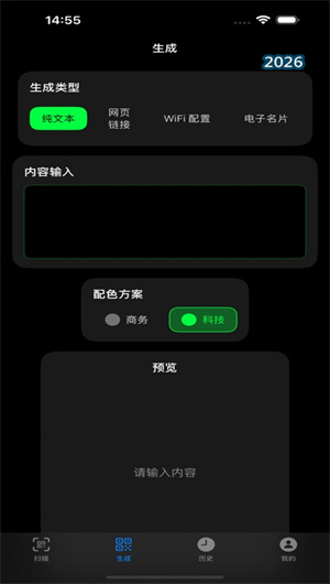 除了扫描,码易生也是一个功能完备的创码工坊。用户可以根据需要,轻松创建多种类型的专属二维码:将纯文本、网页链接、联系人信息(生成电子名片二维码)、Wi-Fi网络配置(SSID与密码)、日历事件、甚至简单的支付金额信息转化为二维码。生成过程支持深度商务科技风定制,用户可在预设的多种视觉模板中选择,或自定义码眼的样式(如点形、方形)、背景与前景颜色、添加中心Logo,并调整纠错等级,在保证可读性的前提下,创造出兼具功能与品牌个性的视觉作品。