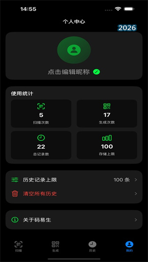 码易生是一款集高颜值设计美学与专业级功能内核于一体的现代化二维码综合管理工具。本应用以独特的暗黑界面搭配霓虹绿动态交互为核心视觉语言,将实用性与科技美学深度融合,旨在为用户提供从极速扫码识别到个性化码生成的全链路解决方案。码易生不仅具备应对各类二维码与条形码的毫秒级识别引擎,更内置强大的暗光环境增强算法,确保在任何光线条件下都能提供稳定可靠的识别体验。同时,它也是一个功能丰富的创码工坊,支持文本、链接、Wi-Fi配置、电子名片等多种内容的专属二维码生成,并配备智能化的记录分类存储与一键复用系统,让码的“扫”与“造”都变得前所未有的高效与优雅,满足从日常使用到商务场景的全方位需求。