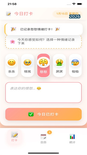 1. 打了吗App的核心是情绪快速打卡模块,提供超过50种精细化的情绪表情符号库供用户选择,支持多标签复合标记功能,允许用户同时记录"喜悦""平静""疲惫"等组合状态。每次打卡不仅记录基础情绪,还可通过情境触发记录器关联具体事件、地点与人物,形成结构化的情绪日志条目。系统内置的自然语言处理引擎可智能解析用户添加的文本备注,自动提取情感关键词并补充到当次记录中,使情绪档案更加立体丰富,为后续的深度分析奠定数据基础。