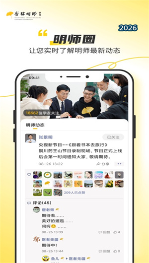 2. “明师动态圈” 功能让学员能够实时追踪中医名家的最新学术动态与实践经验。系统整合了明师专栏订阅、直播预告提醒和学术活动日历三大子功能,用户可关注感兴趣的明师,接收其发布的临床心得笔记、病例分析文章或学术讲座通知。平台每月举办 “明师面对面”直播系列活动,采用双向视频互动技术,学员可在直播中直接提问并获得实时解答。所有直播内容都会通过云端录制系统保存,并自动生成智能字幕文件和要点摘要文档,方便学员后期复习与整理。
