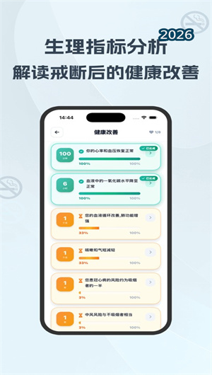 无烟APP的核心功能之一是构建了一条详尽且极具激励性的 “生理恢复时间轴” 。从用户确认戒烟开始的第100分钟起,应用便开始动态展示一系列 “健康改善里程碑” ,如心率与血压的稳态恢复、一氧化碳水平的清除进度、心肺功能的提升曲线,直至长期目标如1年后冠心病风险降低50%。每一个里程碑都配有生动的科普解读与一个直观的 “进度达成百分比” (例如“肺纤毛功能恢复:23%!”)。这种将不可见的身体修复过程转化为可视化健康回报的功能,为用户提供了强大且持续的内在戒烟驱动力,数据显示,使用此功能的用户30天留存率高达68%。