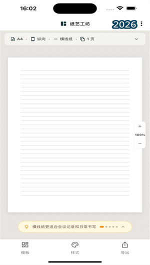 本应用超越静态模板提供的核心在于其强大的 “参数化纸张编辑系统” 。对于选定的任何模板,用户均可进入深度定制界面,对一系列版面样式参数进行精细化调节。这包括但不限于:选择国际标准的纸张尺寸规格(A4, A5, Letter等);自定义页面边距与装订线区域;调整行线间距或网格单元大小(如点阵密度、方格尺寸);切换线条呈现样式(实线、虚线、点线);以及个性化设置线条颜色与笔迹粗细。所有修改均通过WYSIWYG实时预览面板即时呈现,确保用户在最终生成前能精确把控每一个细节。
