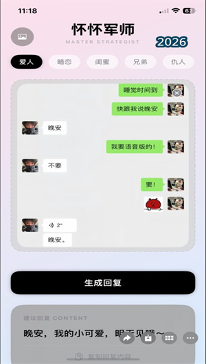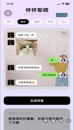怀怀军师,你的AI军师,轻松追到crush,无脑代打。智能表达优化、多场景适配、语气分析、表达练习——帮助你在日常沟通中更清晰、更自然地表达自己的想法。所有生成内容仅供参考,不构成任何情感判断或专业建议。现在就下载怀怀军师,让每一次表达都更自然、更自信。