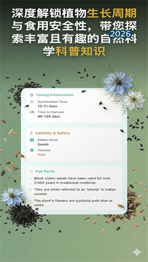 识别后,种子识别APP提供全方位种植信息,包括:理想播种期、光照要求、浇水频率、土壤建议、播种深度、发芽温度等关键参数。百科内容整合权威农业数据,图文并茂,让用户从“认识种子”到“种好植物”一步到位。该功能让83%的用户表示“再也不用到处查种植方法了”。