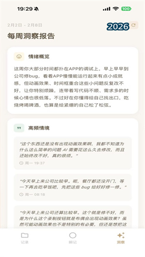 瞬记每周为用户生成一封温暖的洞察信,不是冰冷的数据统计。信中分析高频情绪与触发场景,识别潜意识里的“自动驾驶”模式,提供轻量的心理微实验助你做出改变。洞察信可保存、可回顾,形成个人情绪成长档案。