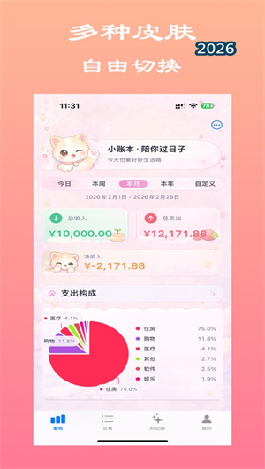 酷爱AI记账内置轻量皮肤系统,在保持极简的同时增添趣味。提供极简基础主题、粉色可爱主题、猫系主题(持续更新),用户可根据喜好一键切换,干净但不单调。
