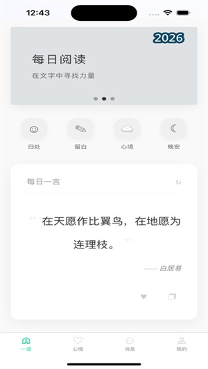 极简一语采用全屏沉浸设计,打开句子时,文字居中显示,背景纯净,没有任何干扰元素。用户可专注品味每一个字句,感受文字的力量。滑动切换句子,就像翻阅一本自己写的书。该功能让91%的用户表示“每句话都值得这样被认真对待”。