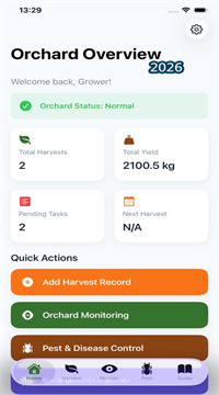 1. 病虫害预警与防控闭环: 果安芯app的一大特色是其病虫害预警与防控闭环机制,帮助果园建立主动防御体系。用户可在巡查时记录发现的病虫害类型(如苹果轮纹病、梨小食心虫、红蜘蛛)、发生地块、危害程度(轻度/中度/重度)、已采取措施(化学防治、生物防治、物理防治),并上传症状照片。系统自动生成防控任务,指派责任人(可设置为“张三负责该地块施药”),并设定复查日期。复查时,用户记录防治效果(有效/部分有效/无效),形成从“发现→处置→复查→评估”的闭环管理。系统还内置常见病虫害图鉴,用户可查阅病害症状图片、发生规律、推荐药剂与安全间隔期。对于多次发生同类病虫害的地块,系统会在次年对应季节推送预警提醒,提示提前预防。这种将记录追踪与主动预警相结合的设计,将病虫害风险从“事后补救”转向“事前预防”。