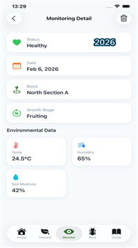 3. 深度监测与地块级生长追踪: 果安芯app内置了深度监测模块,支持对果园进行地块级的精细化追踪。用户可为每一地块建立独立档案,记录品种、种植年份、株数、株距行距、土壤类型(沙壤土、黏土)、灌溉方式(滴灌、喷灌)。在生长周期中,系统按萌芽期、开花期、结果期、成熟期划分生长阶段,用户可定期记录每个地块的物候期进度(如“4月10日进入盛花期”),并上传照片记录树体长势。应用支持接入土壤传感器或气象站数据(需手动录入或API对接),记录土壤湿度、土壤温度、空气湿度、光照强度等环境参数,并以趋势图展示。当某地块的土壤湿度持续低于阈值时,系统推送“建议灌溉”提醒。这种将地块档案与环境监测相结合的设计,让果园管理从“整园统一操作”升级为“因地施策”的精细化管理。