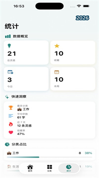 3、灵感热度图,用彩色日历展示哪天思维最活跃,点击可直达当日全部记录。