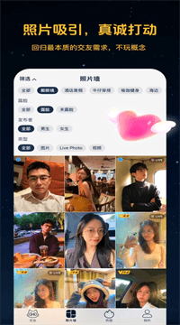 1、照片墙刷到的全是原图直出自拍,Live Photo和短视频也不压画质,左滑无感右滑喜欢,三秒决定要不要开聊,省掉互相试探的客套。